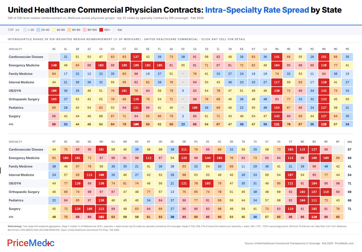 Every number in those cells represents a gap in pay. It does not show the actual price. Specifically, it shows the spread between what the higher paid doctors get and what the lower paid doctors get for the exact same specialty in the exact same state. The chart measures this gap using the Medicare rate as a baseline.
